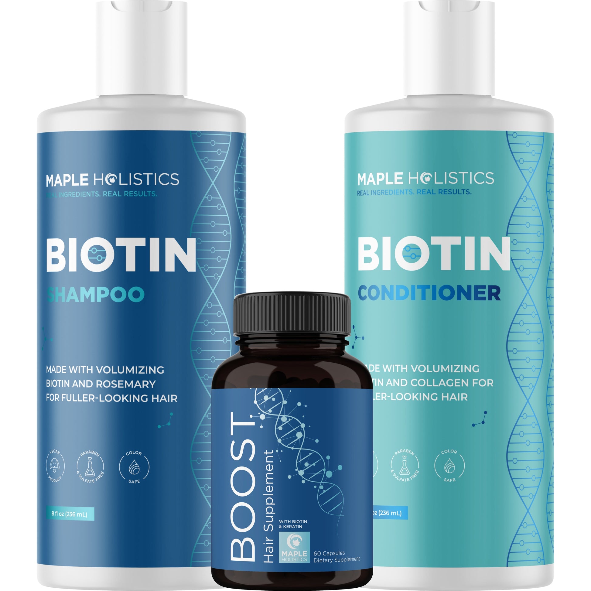 Our nutrient-rich Biotin Bundle (Biotin Shampoo, Biotin Conditioner and Biotin Supplement) works to provide you with thicker locks, glowing skin and amazing nails. Use our biotin supplement daily for stronger, longer, healthier hair growth!