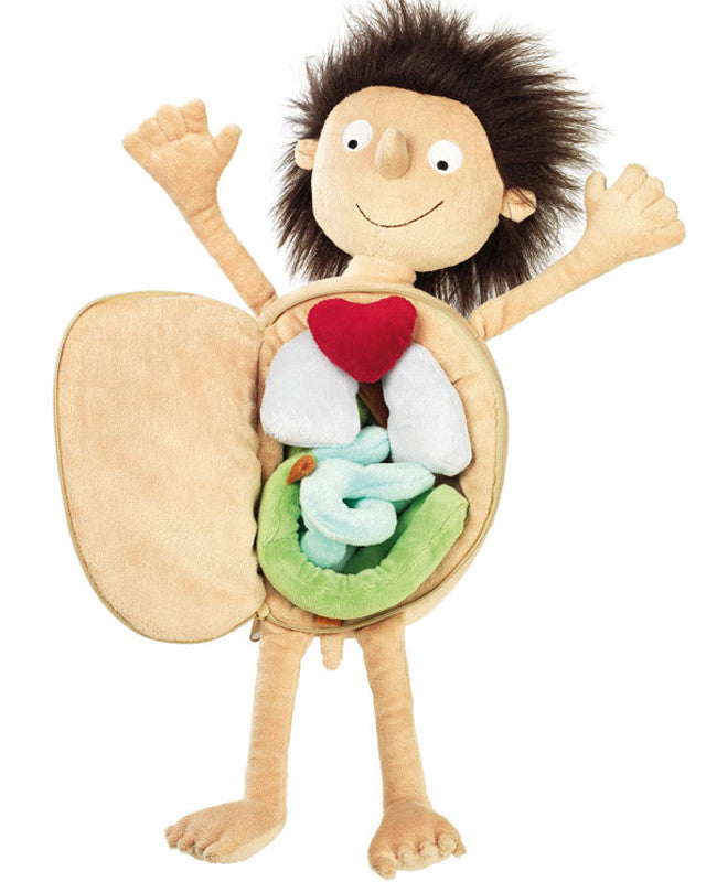 All of Erwin’s organs are made of super-soft plush and can be removed and reaffixed with the help of color coded Velcro patches. He comes with a huge smile and funky hair, a hospital gown and an instructive manual, allowing your kids to take that clinic game to the next level.